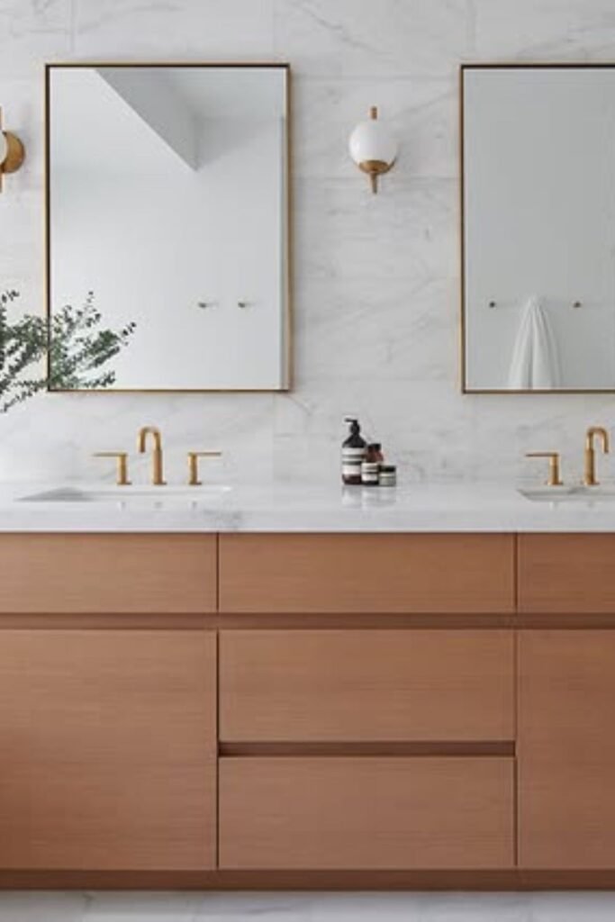 You can place a slatted walnut vanity in front, and use brass-rimmed mirrors and globe lights to give you a bright, well-balanced finish.