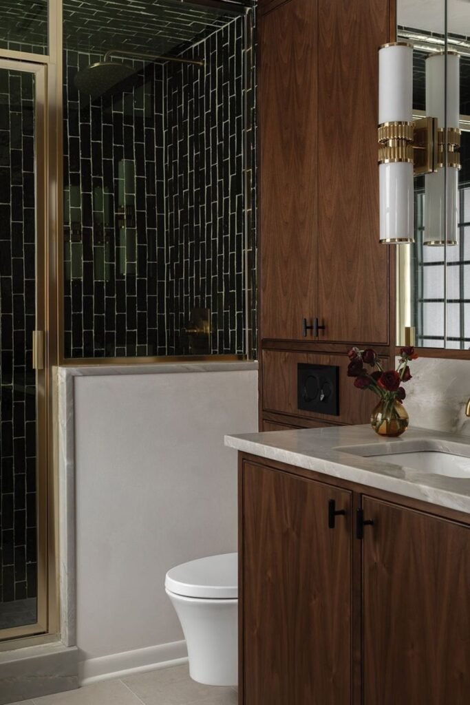 You can add instant depth to your bathroom with deep green tile, especially when you pair it with warm wood cabinets.