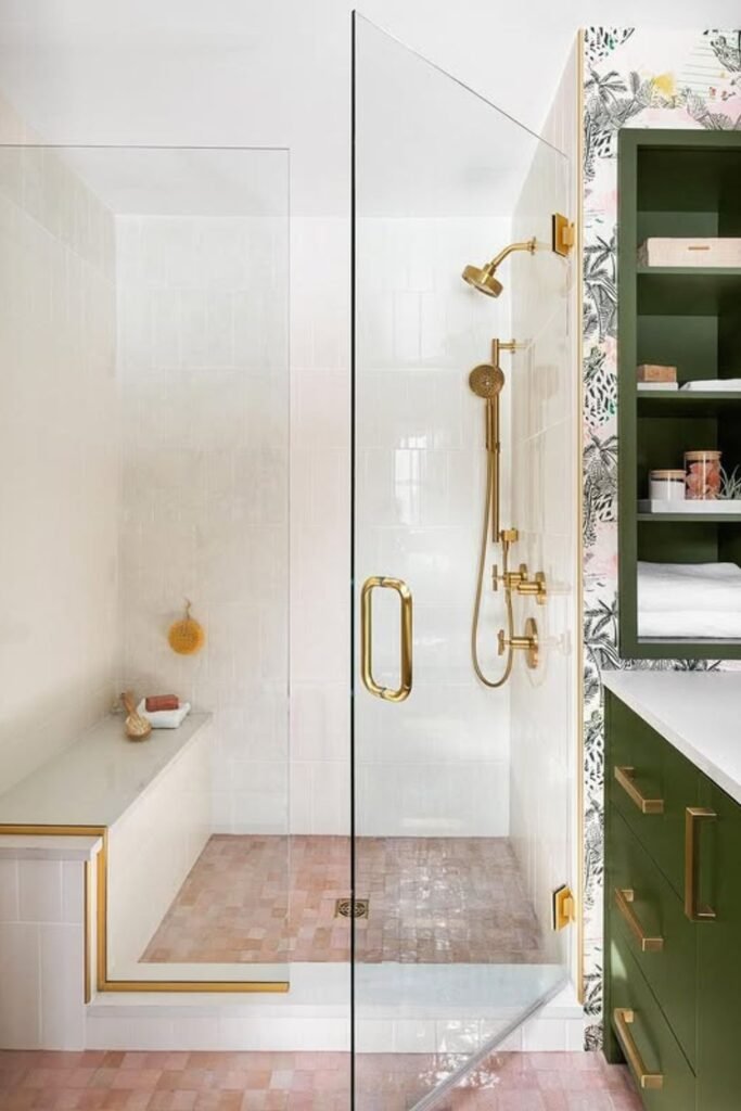 You can create a warm, relaxing shower corner with soft pink zellige tiles and a built-in bench that feels like a tiny spa.