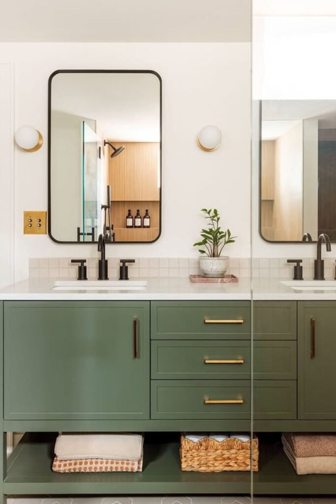 You can create a calm, organized shared bathroom with soft sage tones, and this double vanity shows exactly how to do it.