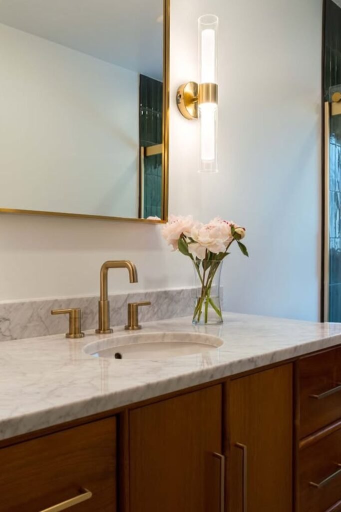 You can lift a simple vanity instantly with warm brass, especially if your bathroom already has darker tones nearby.