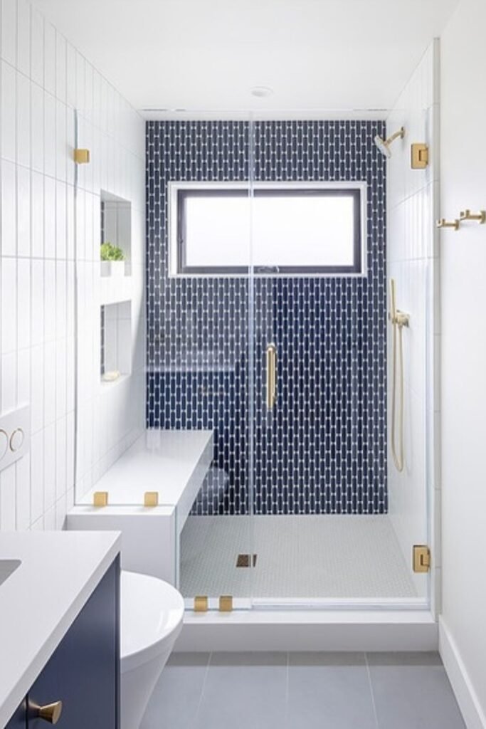 You can transform a long, narrow bathroom by using bold navy tile as a clean focal point.