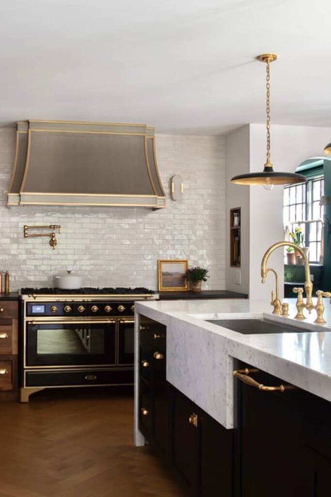 You notice brass showing up on the cabinet hardware, faucet, and pot filler, so you instantly feel that warmth and intention.