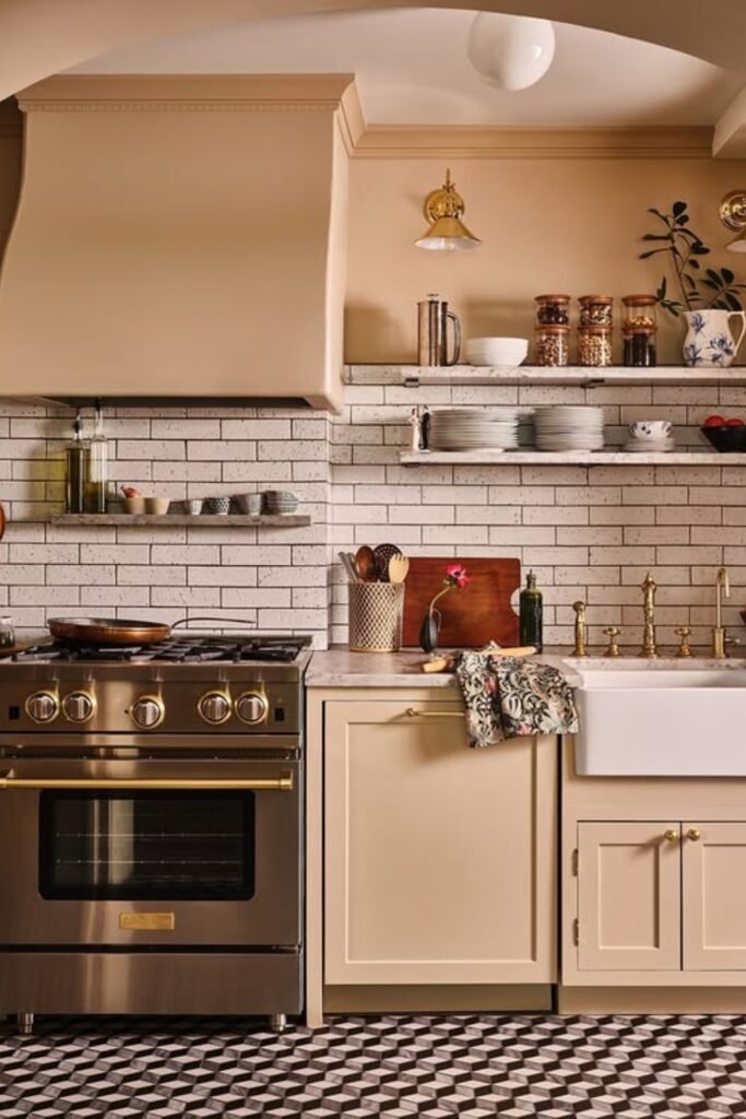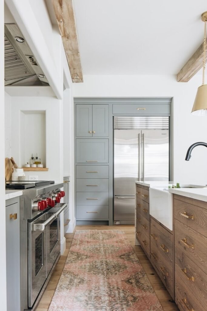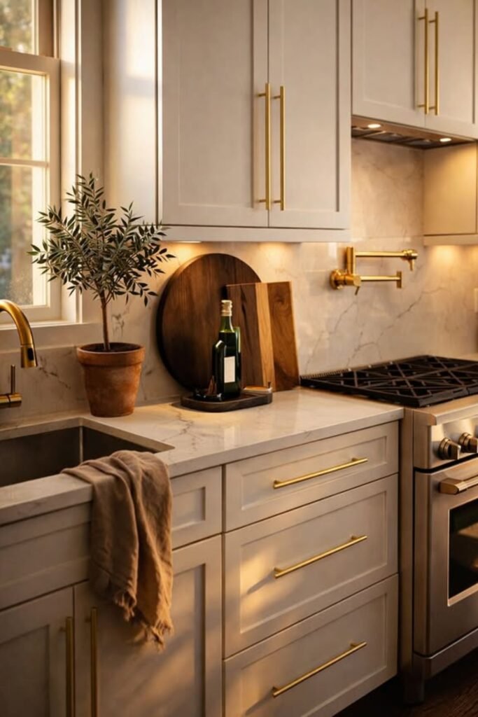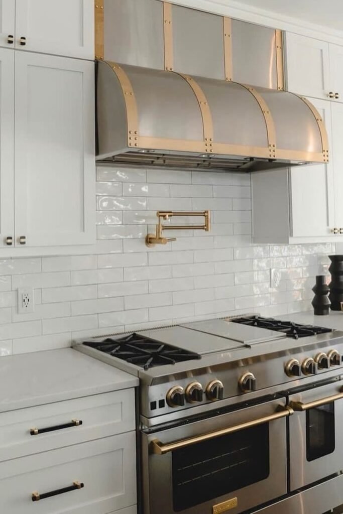 This idea works best if you want your kitchen to feel lived-in and collected. You can stick to warm metals and let stainless stay practical instead of decorative.