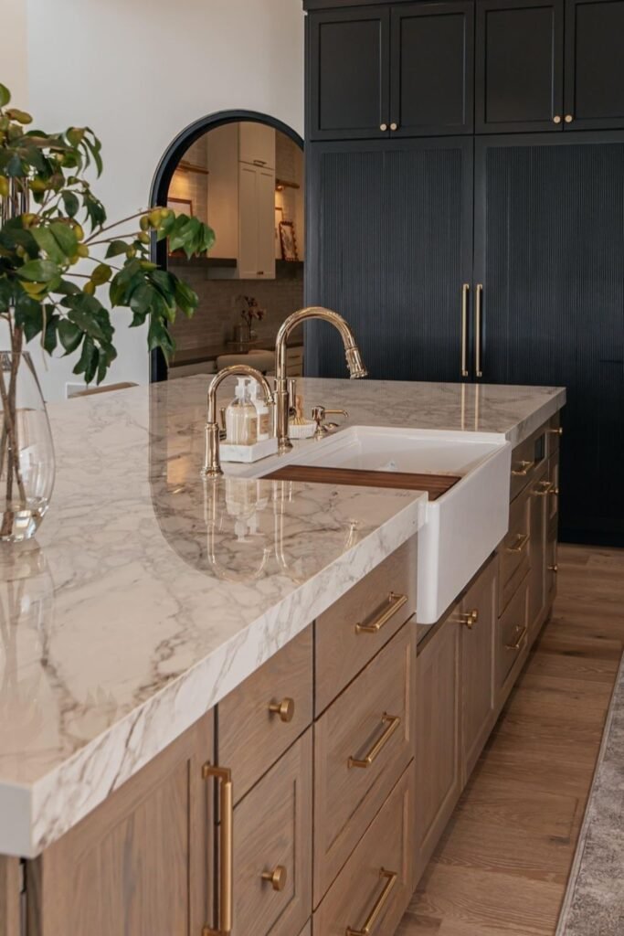 This works best for you in open kitchens, where you can separate metals by zones and still keep the layout feeling calm.