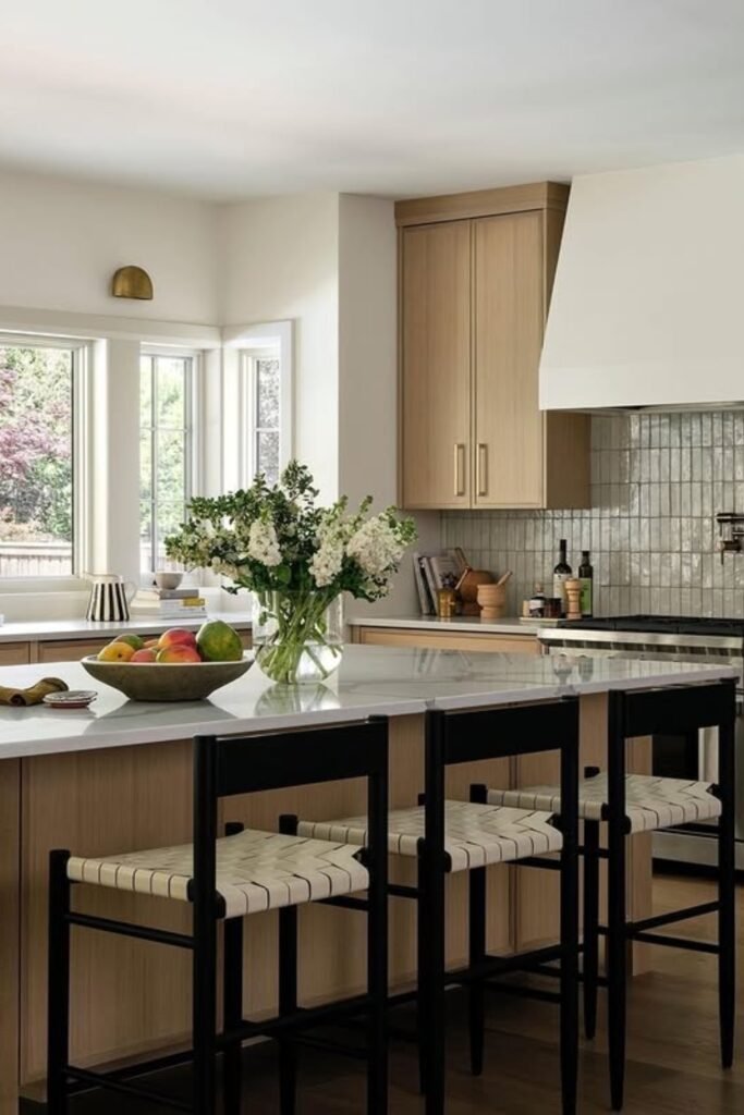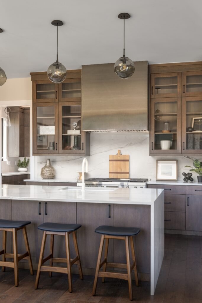 You can tell this kitchen works because wood stabilizes everything first. You see warm wood cabinets and stools grounding the space, so the metals don’t feel harsh.