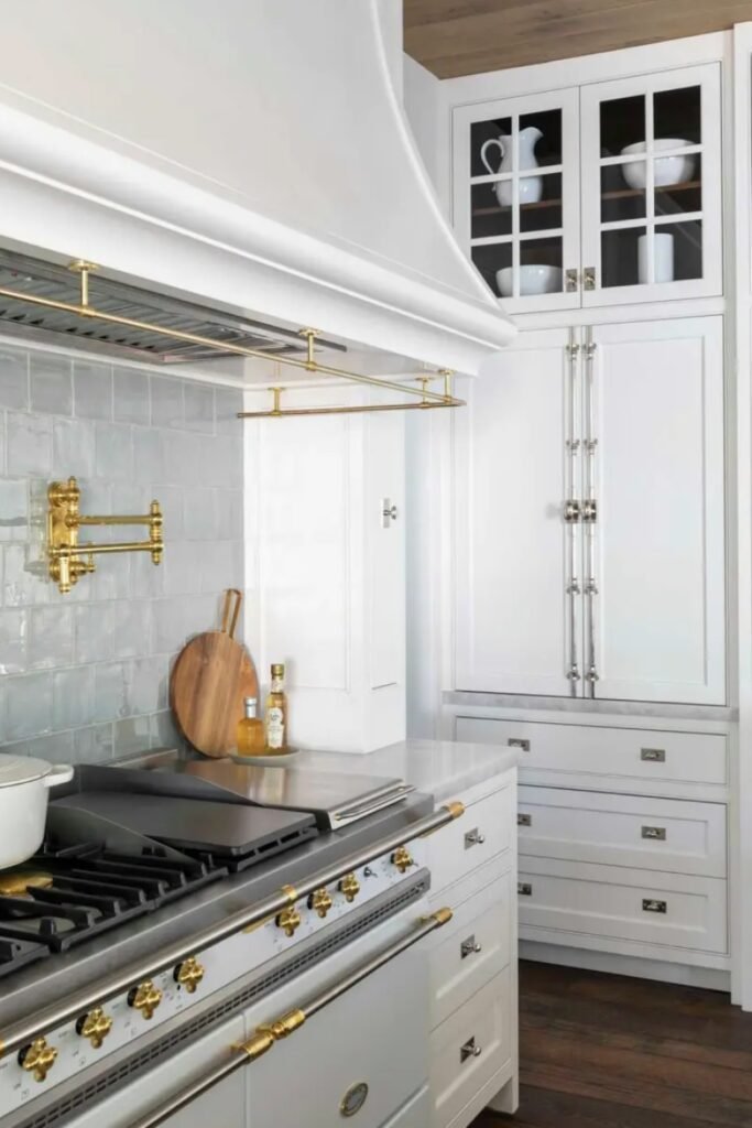 You’ll notice brass appearing on drawer pulls and the pot filler, adding warmth where your hands and eyes naturally go.