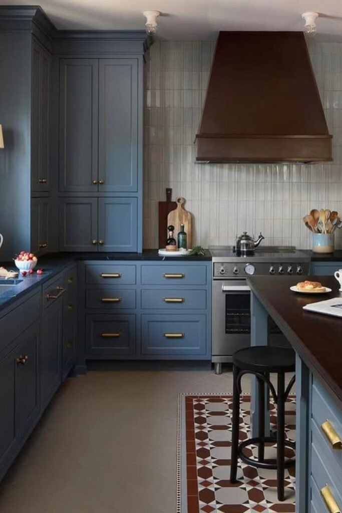 You can tell this kitchen works because the deep blue cabinets do most of the visual work for you.