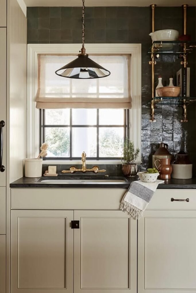 You see black on the faucet and pendant frames, giving structure and definition. If you keep black to bold shapes and let brass act as the bridge, everything stays clean.