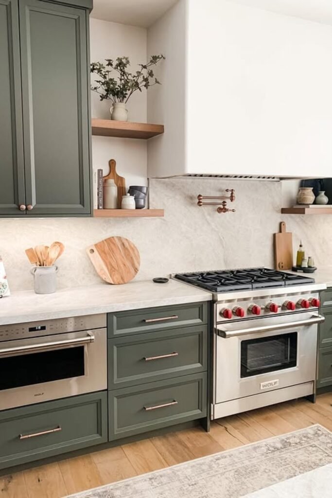 The soft green cabinets create a calm base for you, so stainless appliances don’t feel cold and brass hardware never feels flashy.