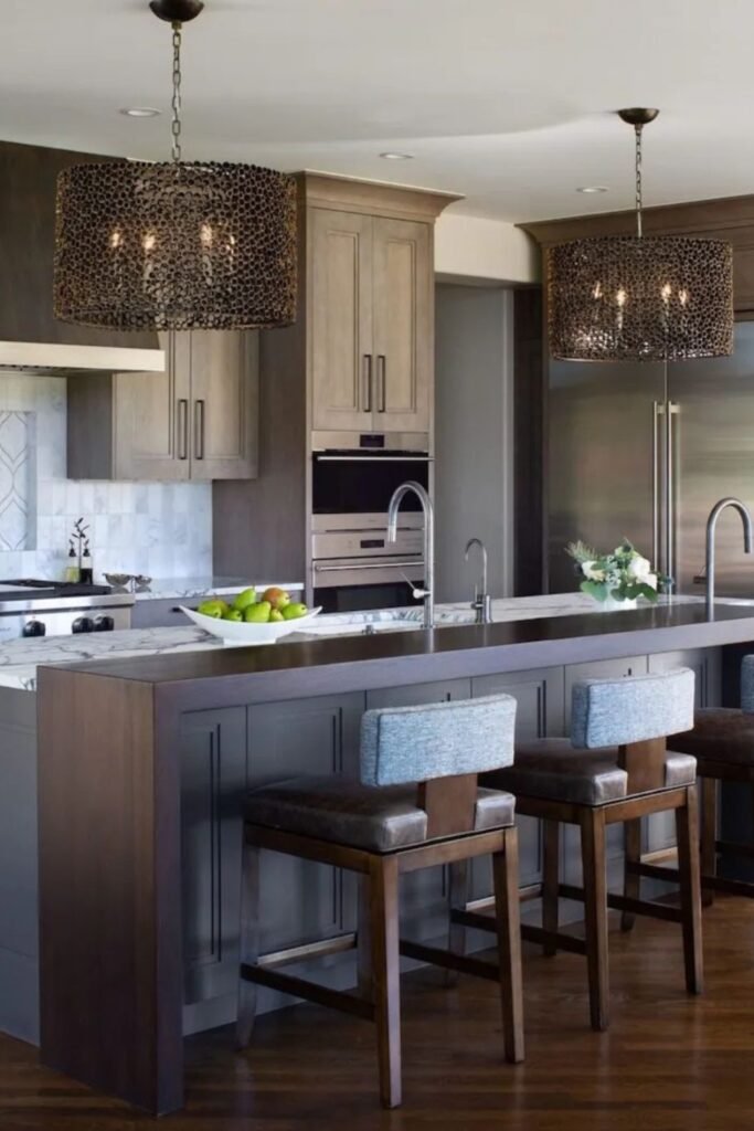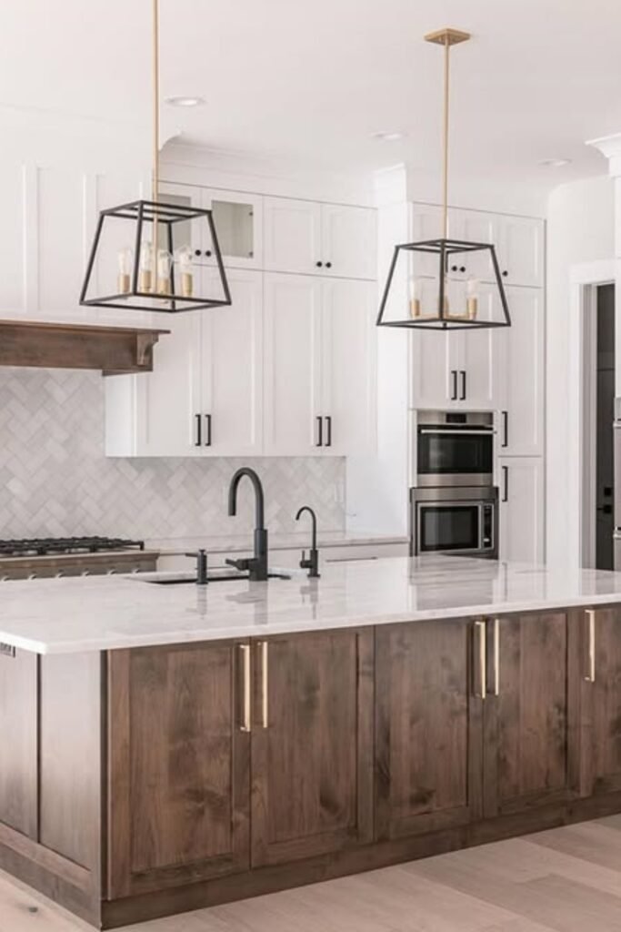 You notice darker metal staying in the pendant lights and island base, adding depth without heaviness.