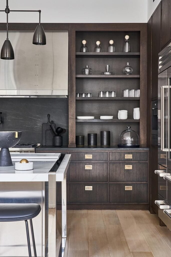 When you add open shelves and warm cabinet tones, you soften the contrast so it doesn’t feel overly polished.