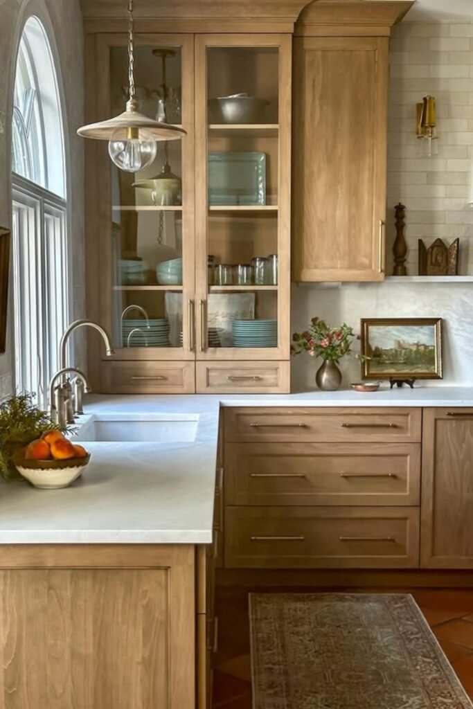 You see light wood cabinets setting a relaxed base, while brass hardware and wall lights add warmth without pulling focus.