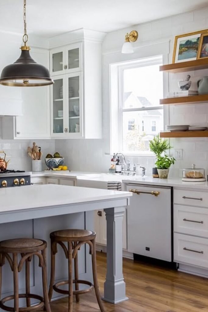 You’ll notice this kitchen keeps things calm by using contrast in small amounts. You see brass on the cabinet hardware and wall sconce, adding warmth against white surfaces.