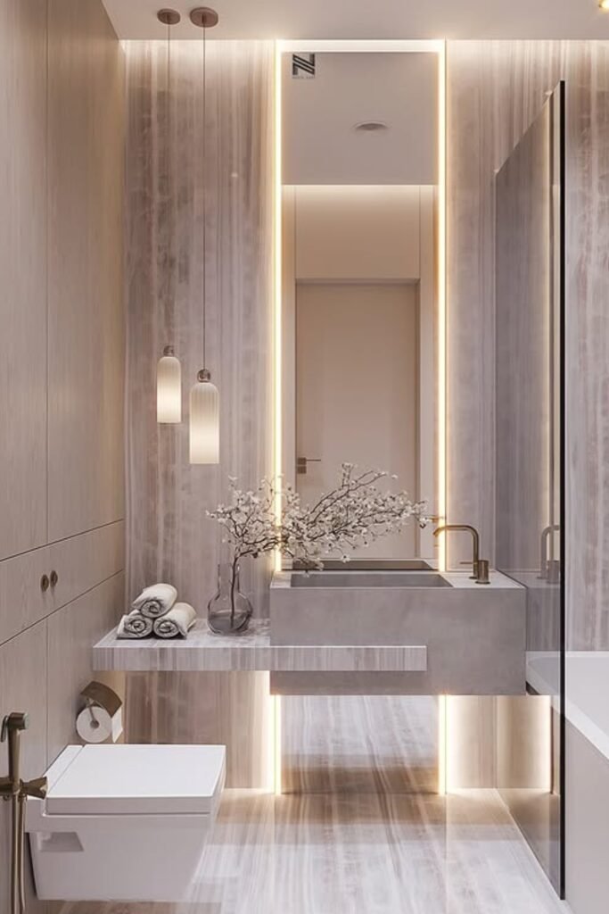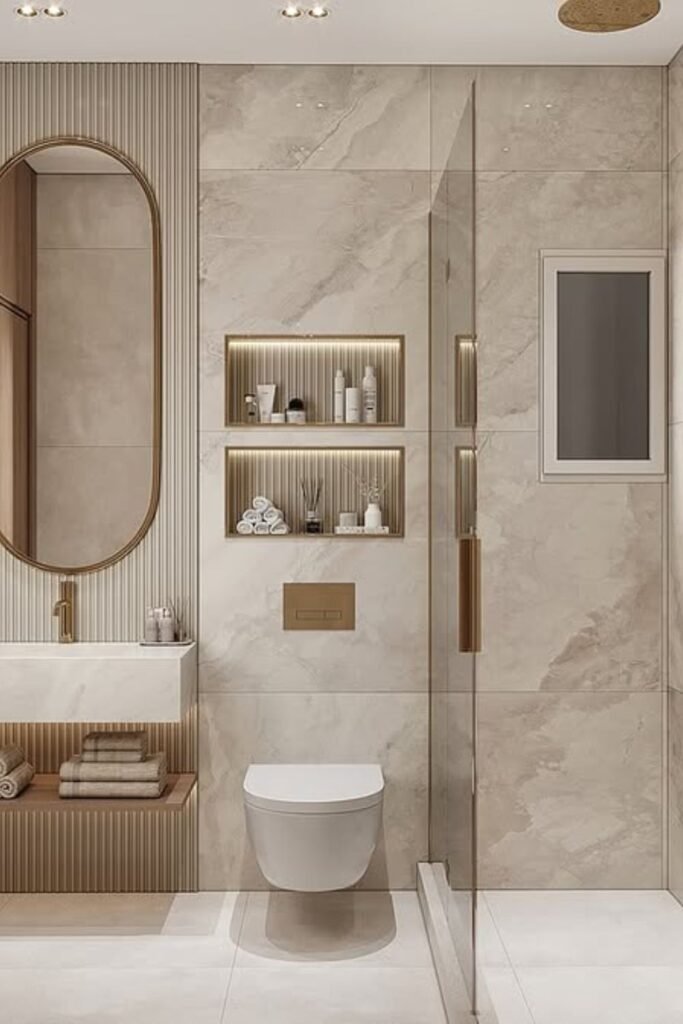You can build a clean, modern base with soft marble walls, and warm niche lighting gives your bathroom that hotel-style glow you will love.