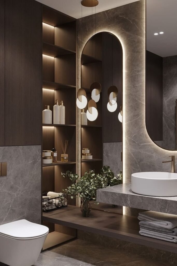 You can sharpen a dark modern bathroom quickly when you use soft backlighting around a tall, curved mirror, it gives your space that clean, hotel-like finish.