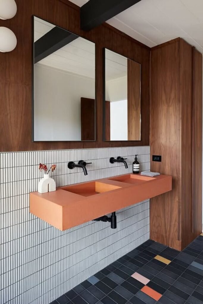 If you want the same bold punch, keep your walls clean and let your sink carry the personality.