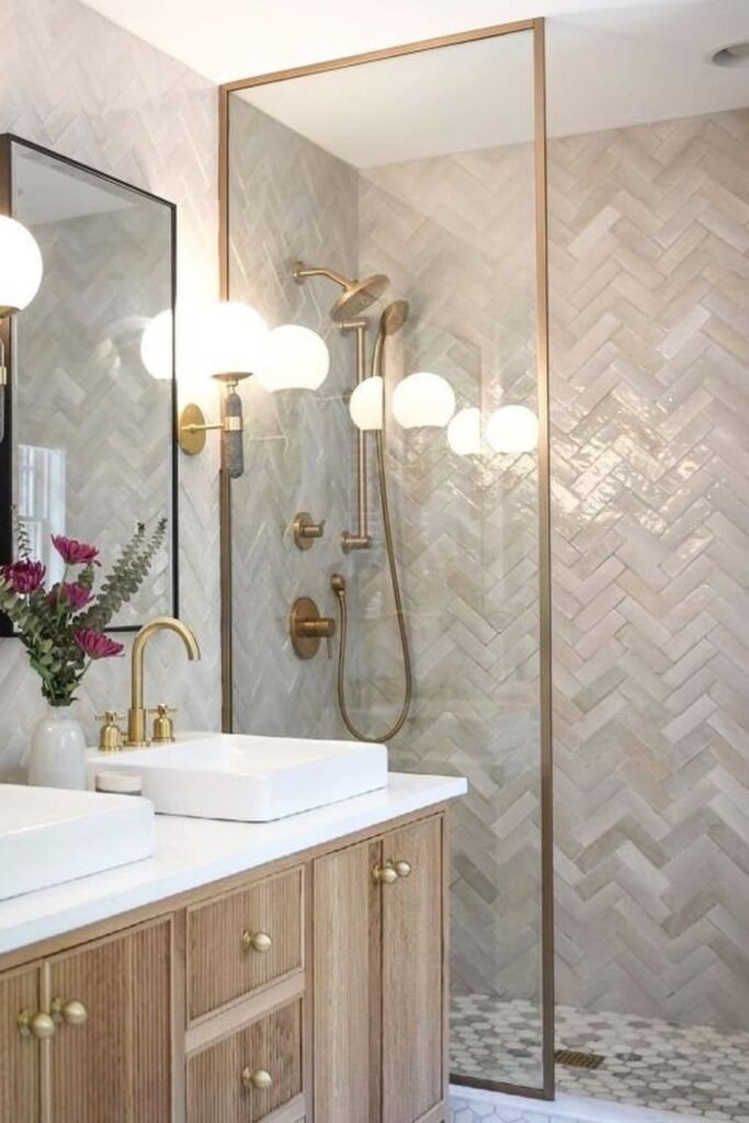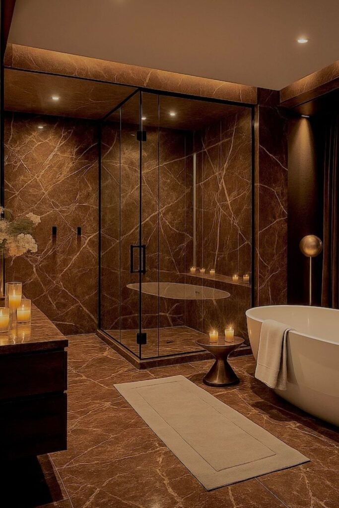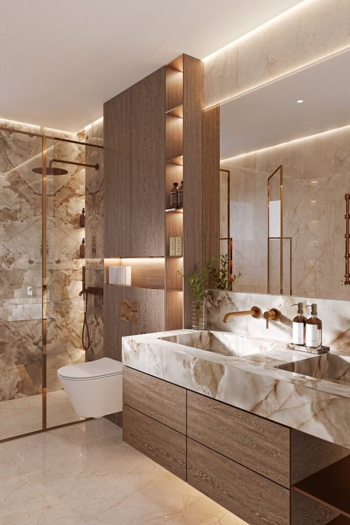 This style works especially well if your bathroom already gets natural light, because the glow helps you highlight every warm vein in the stone.
