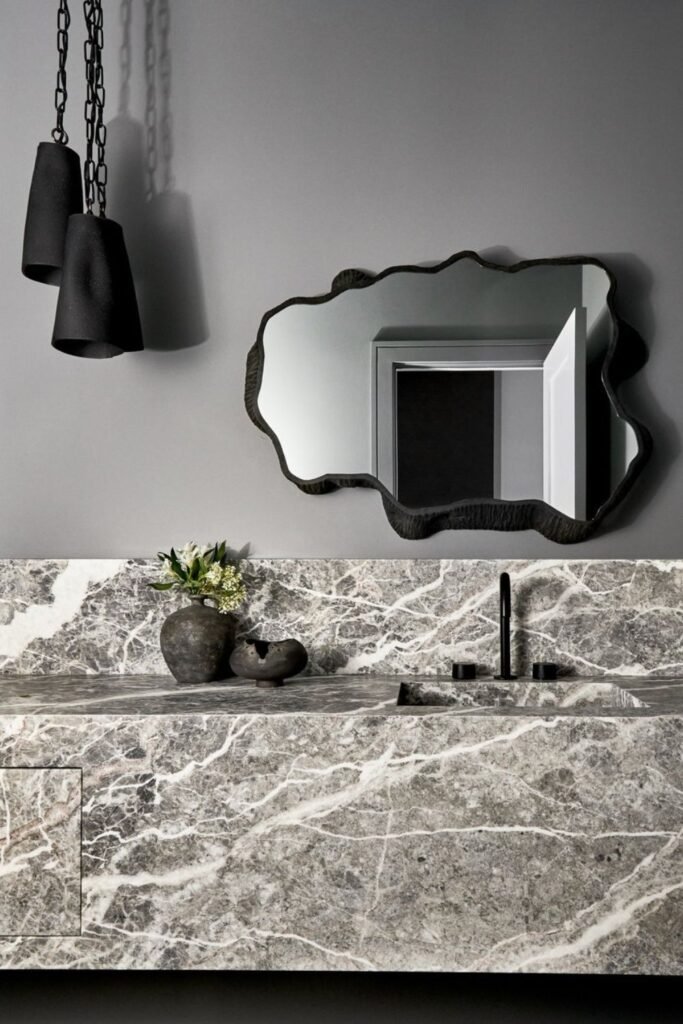 You can make even a compact bathroom feel like a showpiece when you choose striking marble with deep, dramatic veining.
