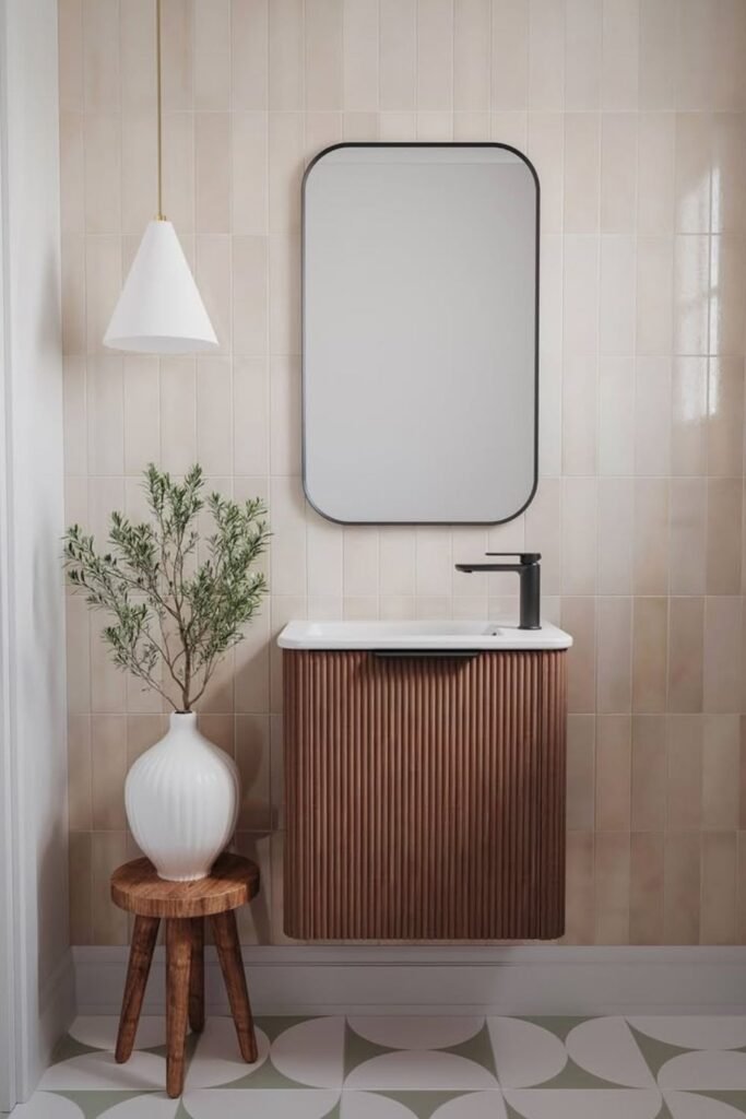 A compact fluted vanity gives you texture without taking up space, and the black faucet keeps your whole look sharp.
