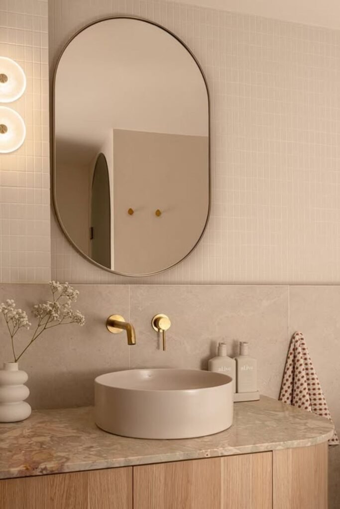 When you add an oval mirror, a rounded basin, and a smooth-edged vanity, you make the whole area gentle on your eyes.