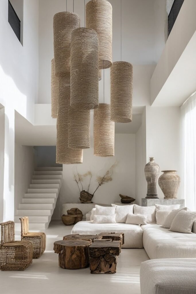 The oversized woven pendants here draw your eye upward and add movement without chaos.