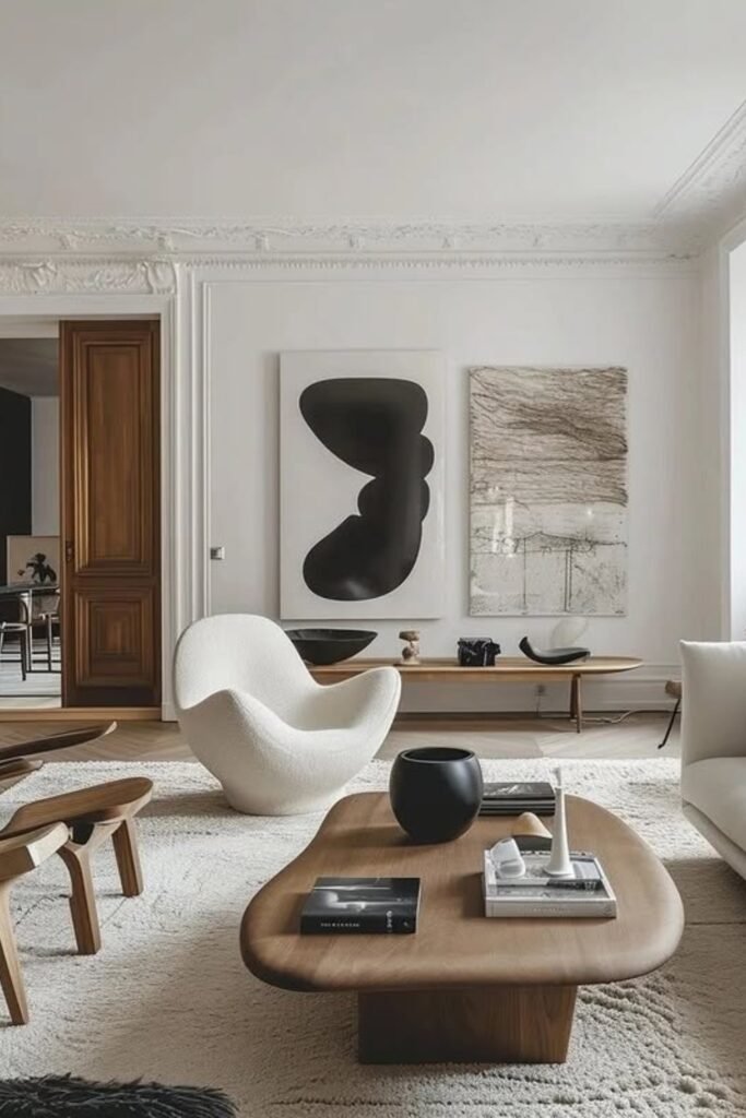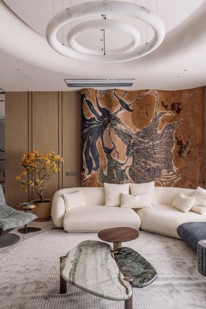 A bold mural, oversized artwork, or sculptural rug becomes the star, while everything else stays simple.