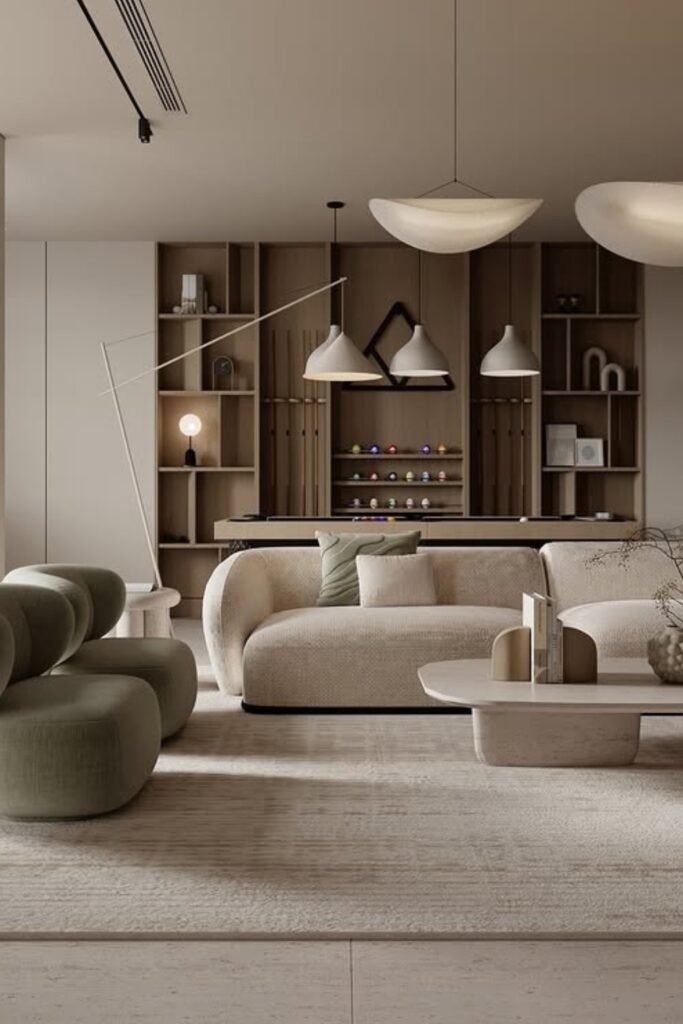Your rounded furniture and warm beige shades keep your space sophisticated yet soothing, while a sage chair introduces gentle color.
