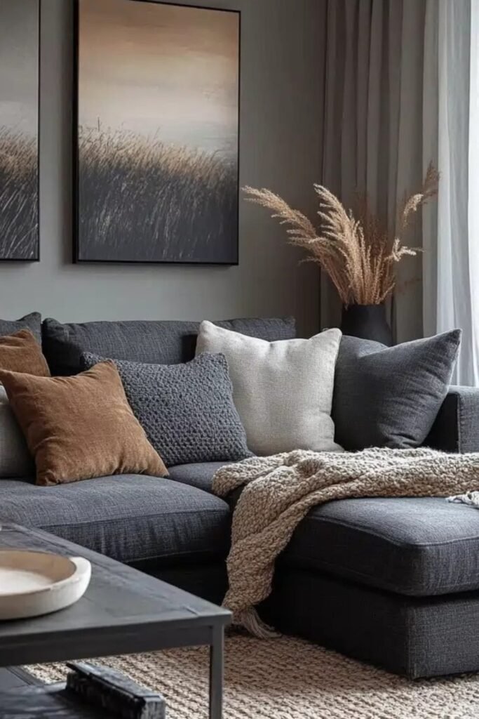 You can make dark tones feel cozy, not cold, by layering warmth into them. Deep grays and charcoals get instant life from caramel, beige, and earthy accents.