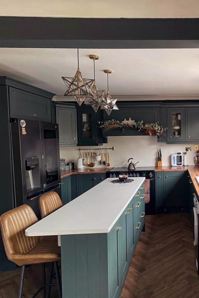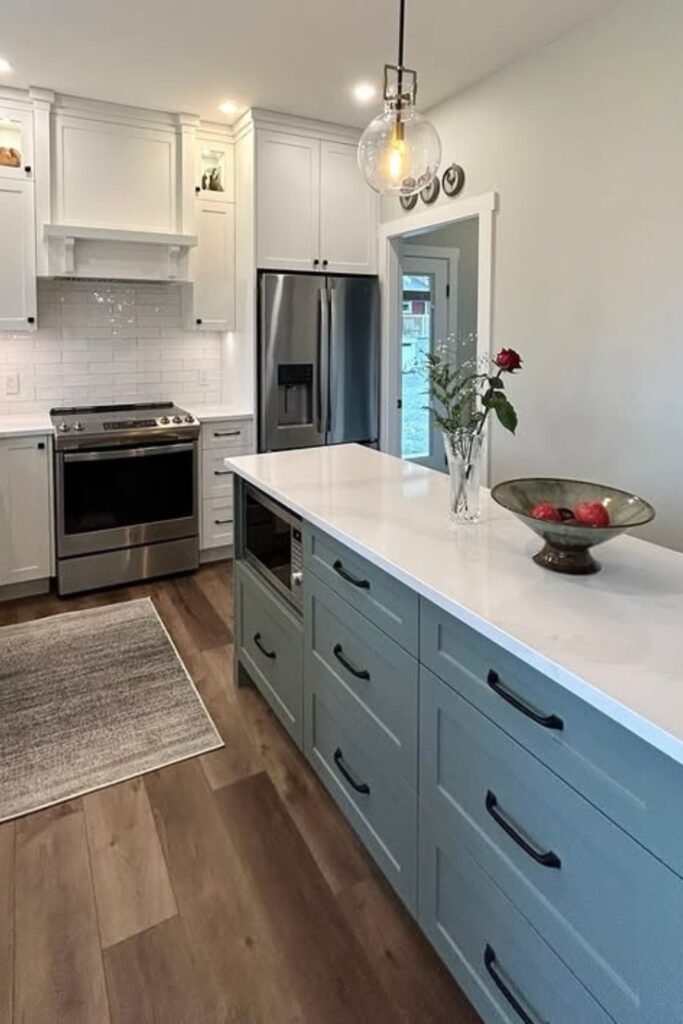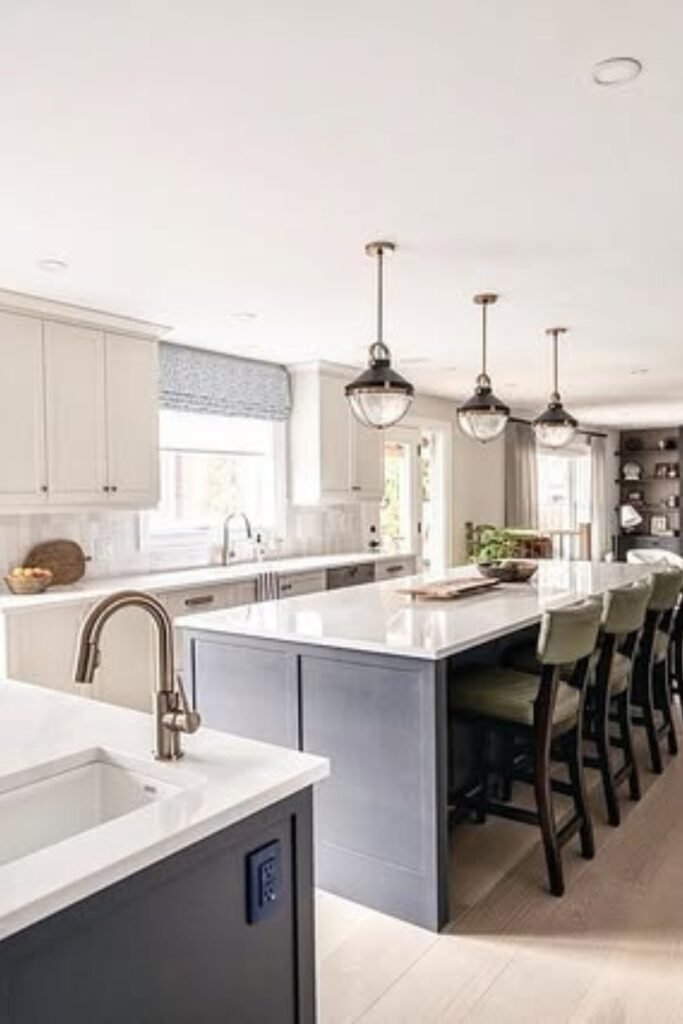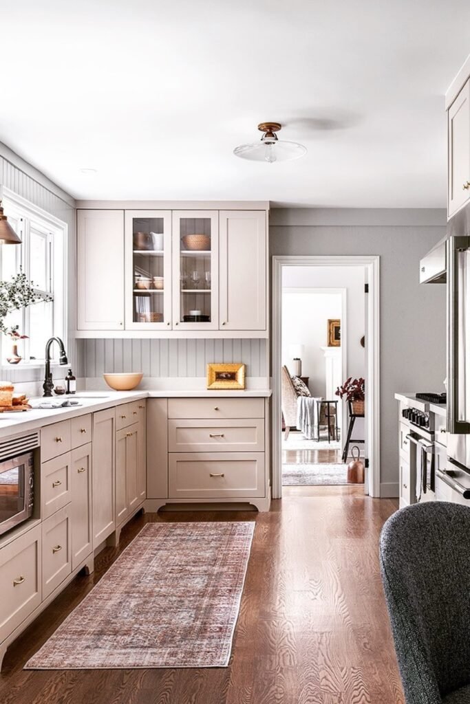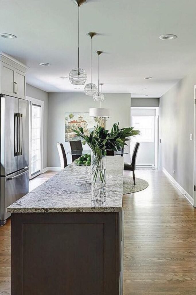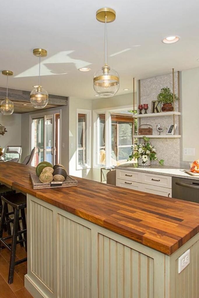 This works best when one side of the kitchen leads into another room, so the space doesn’t feel boxed in.