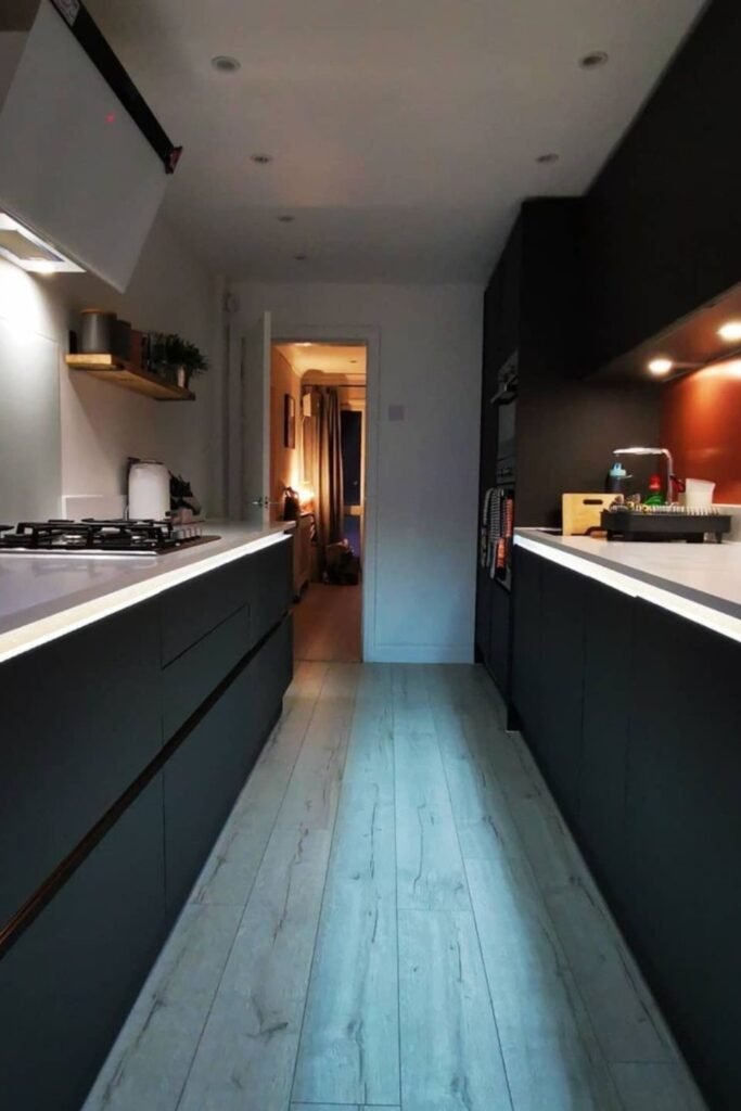 This works best in long, enclosed kitchens. You can add continuous LED strips under upper cabinets and keep overhead lights subtle so the walkway stays open and easy on the eyes.