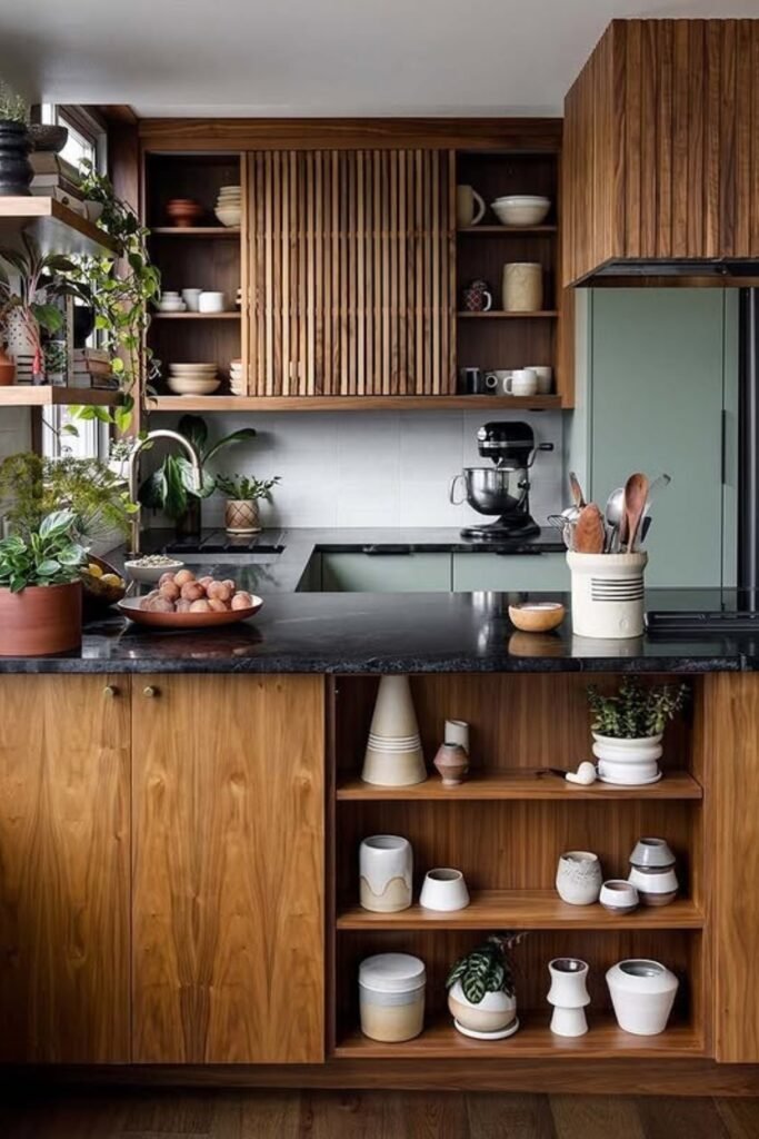 You can use flat-front wooden cabinets, mix in a few open shelves, and keep the layout simple so the material becomes the feature, not the clutter.