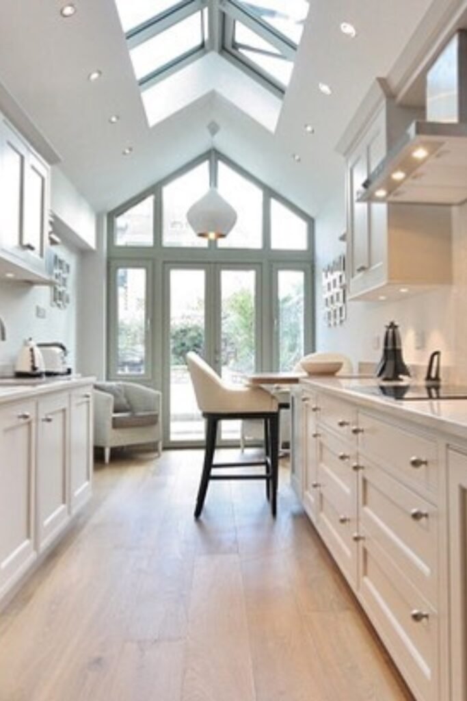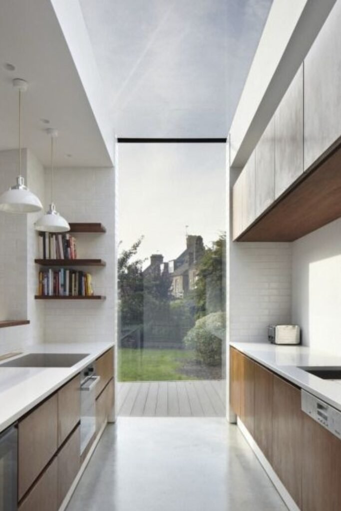 A narrow kitchen instantly feels larger when light comes from above instead of just the sides.