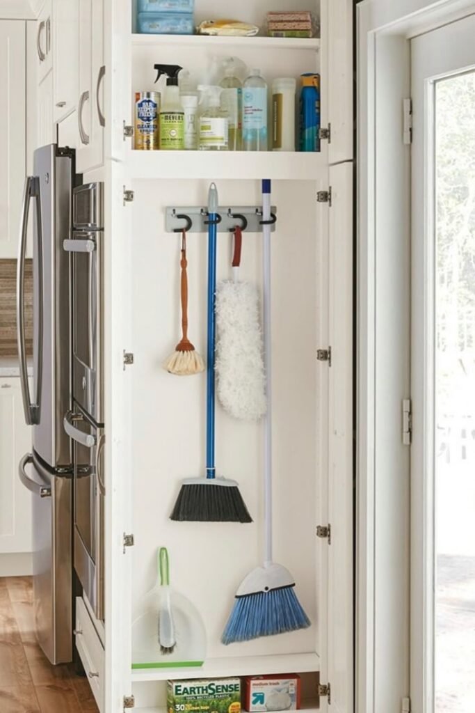 You can convert a slim pantry or unused cabinet into a utility zone with hooks, shallow shelves, and door-mounted storage.