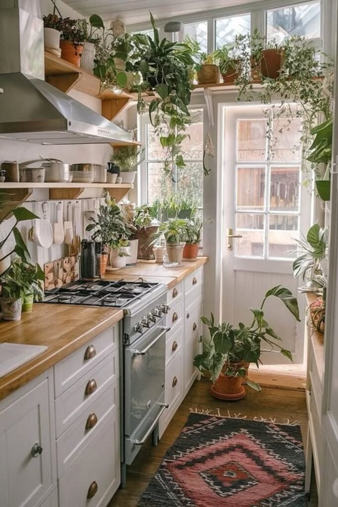 The plants do more than decorate a narrow kitchen, they soften the edges and make the space feel lived-in instead of tight.