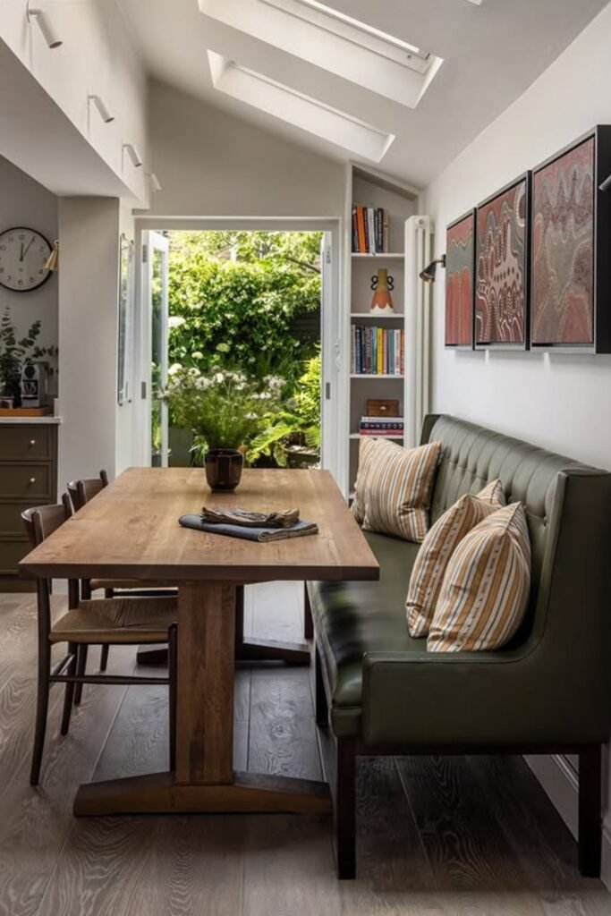 A narrow kitchen doesn’t have to stop at cooking. This built-in bench turns the end of the kitchen into a natural dining zone without widening the room.