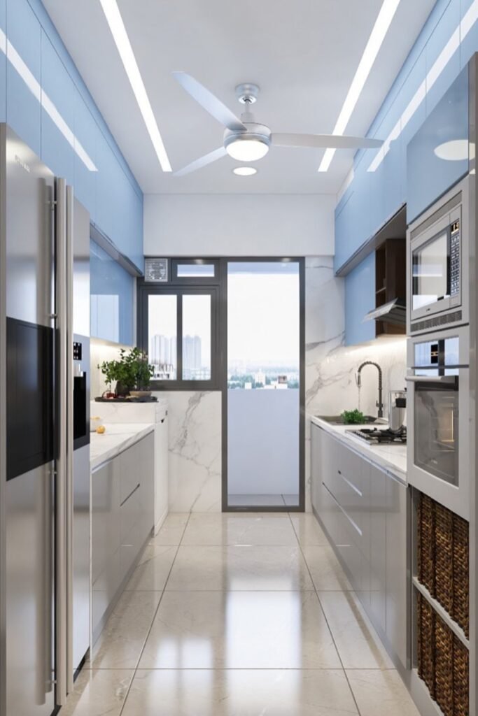 This setup fits best in long kitchens where traffic flows straight through.