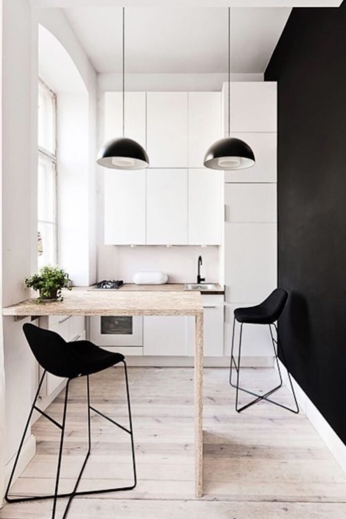 You can keep cabinets flat and light-colored, add a slim table or ledge for dining, and use contrast on the opposite wall to give the kitchen depth instead of clutter.