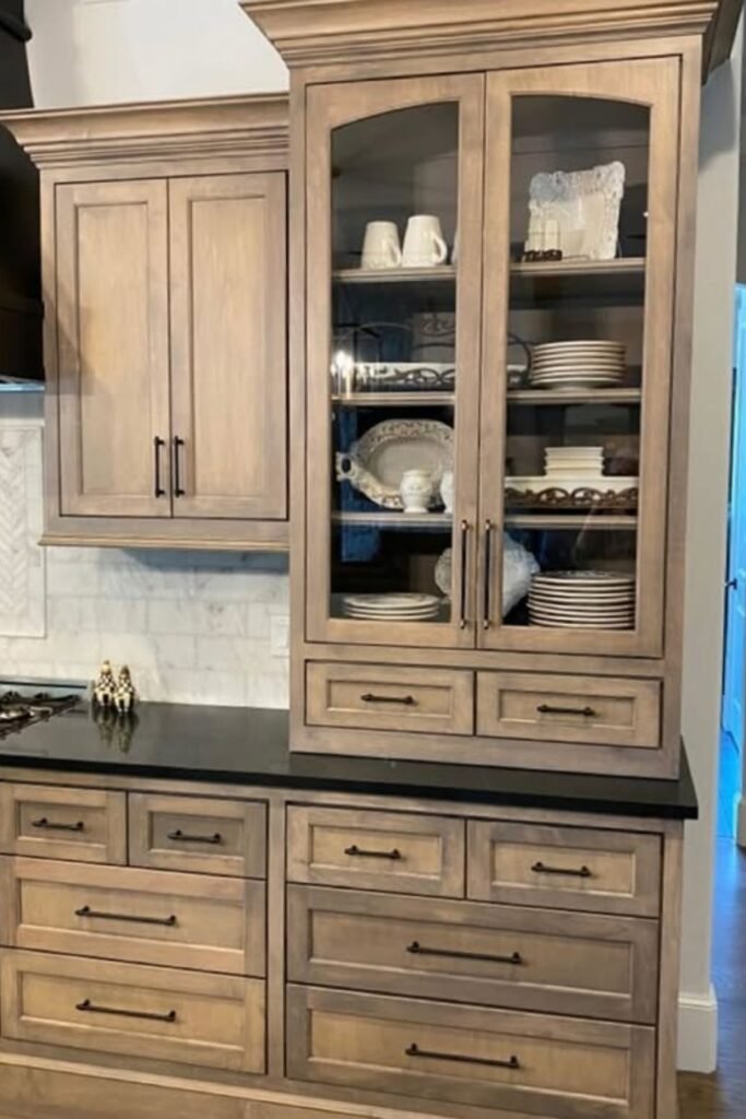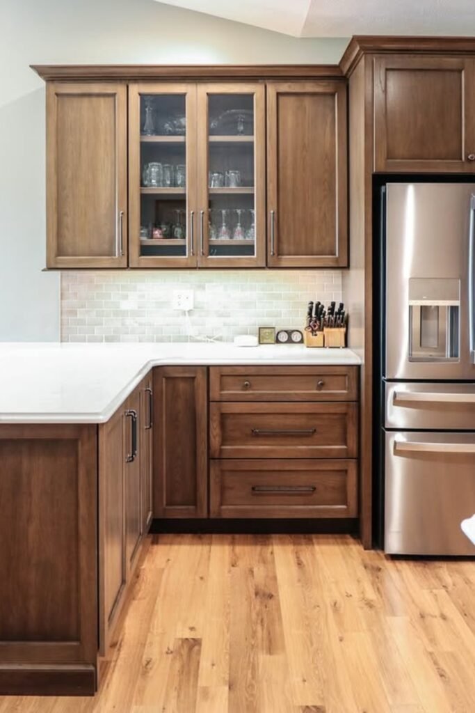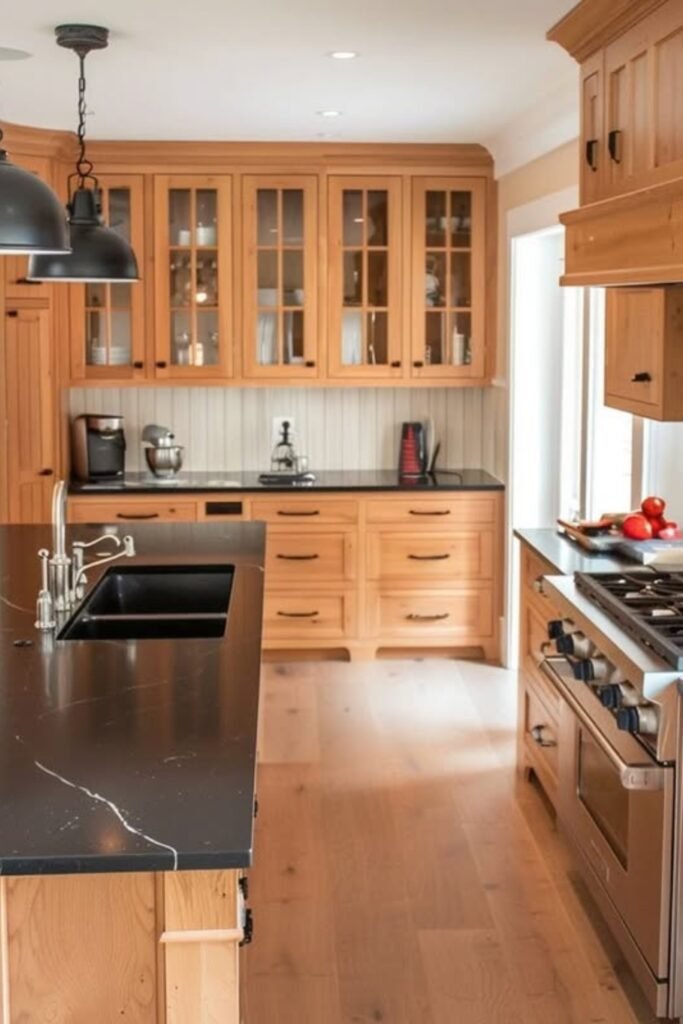 You’ll notice how warm wood cabinets are paired with simple countertops and subtle backsplash tones. You can add black hardware for clean contrast so your space won’t look flat.