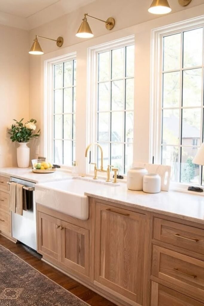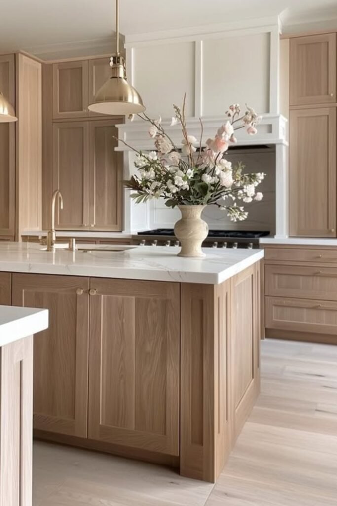 You’ll see the pale oak cabinets stay subtle, while brass fixtures add warmth.