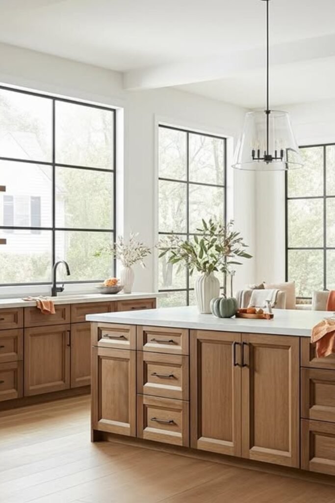 To recreate this, combine medium wood cabinets with light counters and layered lighting, you’ll keep your kitchen warm and inviting.