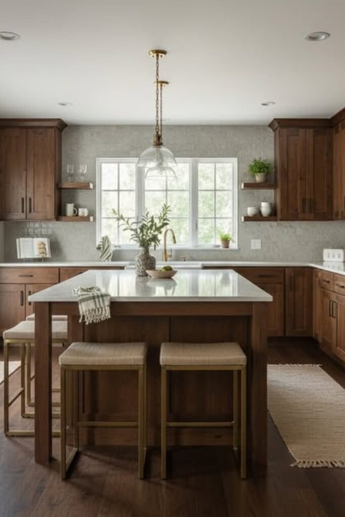 You’ll see darker natural wood cabinets give depth, while the light countertop keeps everything balanced.