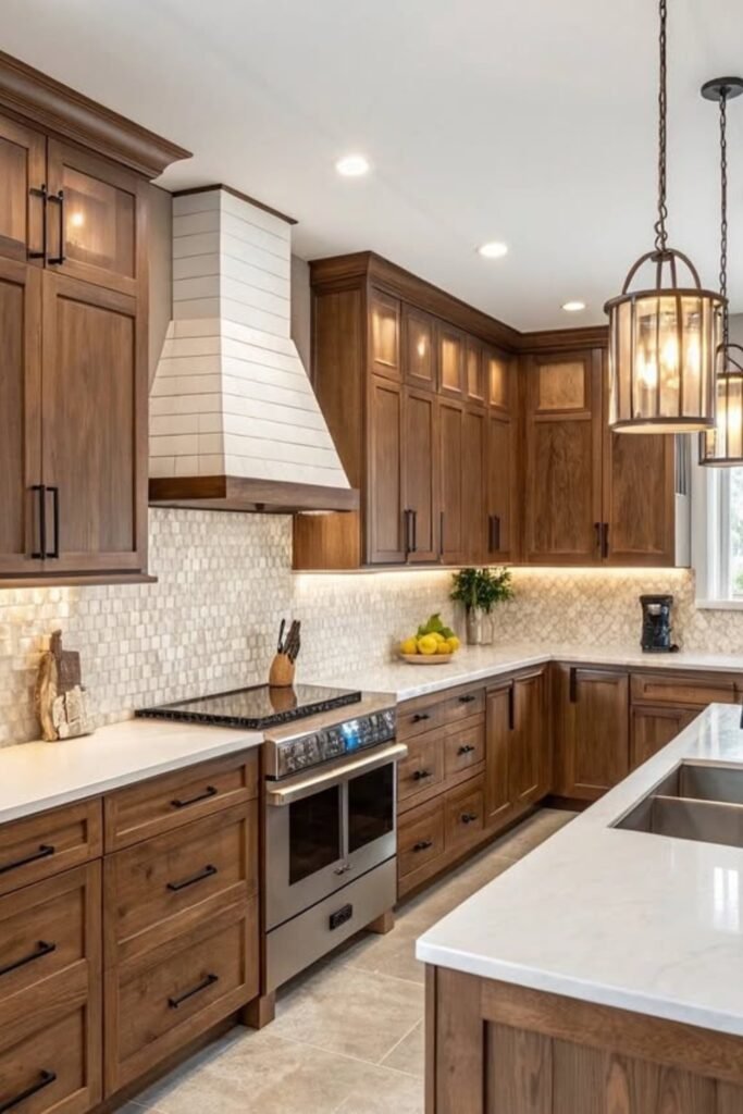 You’ll see the rich wood cabinetry paired with a white range hood and textured backsplash keeps the space balanced.