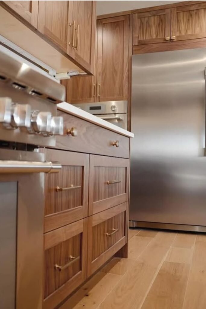 You can go with light oak, walnut, or simple cabinet styles like shaker or flat panels, you’ll see how they help your natural wood look modern instead of outdated.