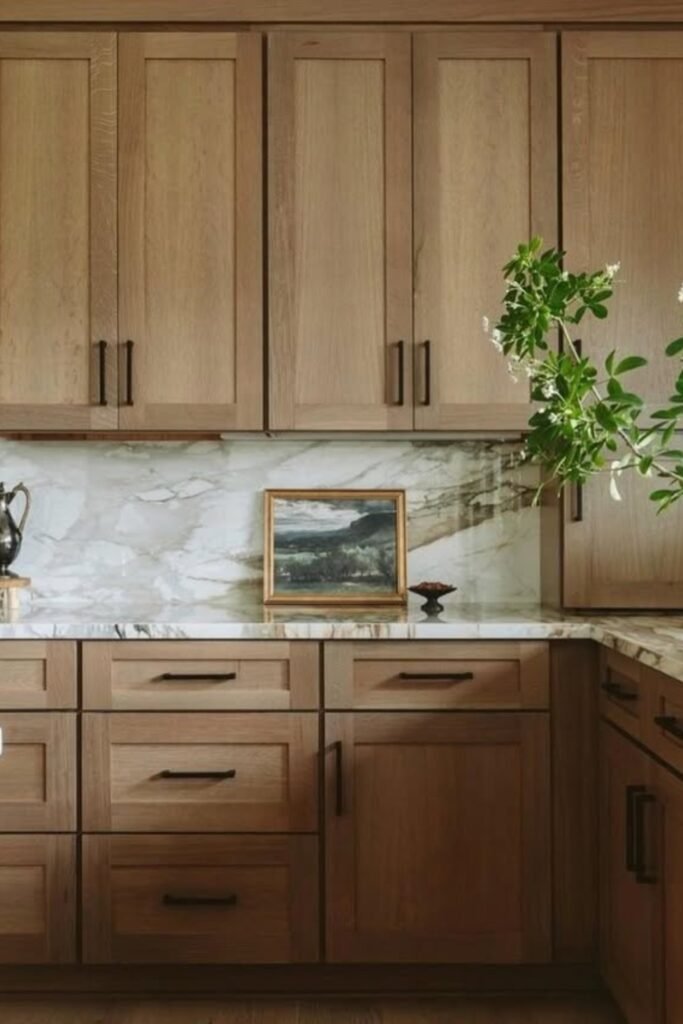 You’ll see light oak cabinets paired with a soft marble backsplash, letting the wood grain stay the star.