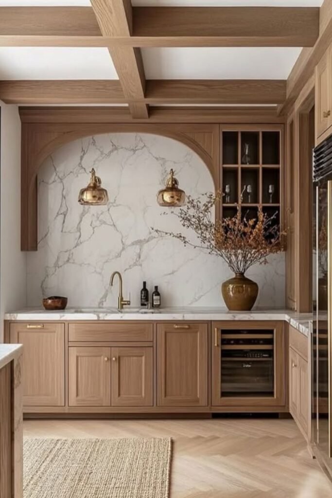 You want your natural wood cabinets to feel truly custom? You can add a bold backdrop like an arched marble wall.