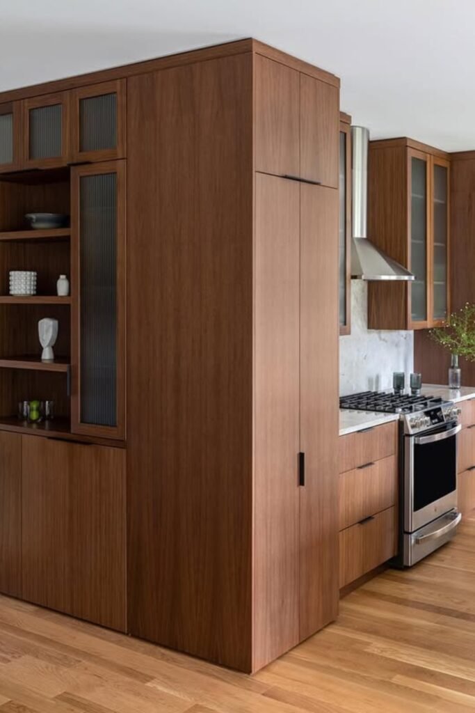 You can go with flat walnut cabinets with long horizontal grain, they instantly make the space feel sleek and architectural.