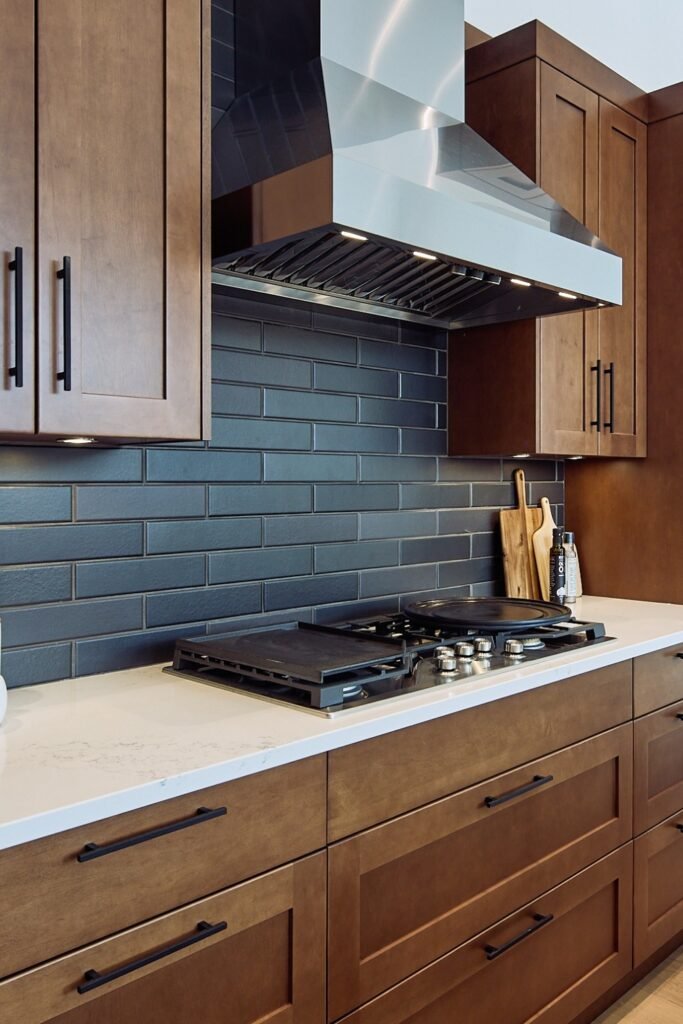 If your cabinets are medium to dark wood, you should pair them with a deeper backsplash color and light countertops, you’ll keep the kitchen balanced and visually sharp.