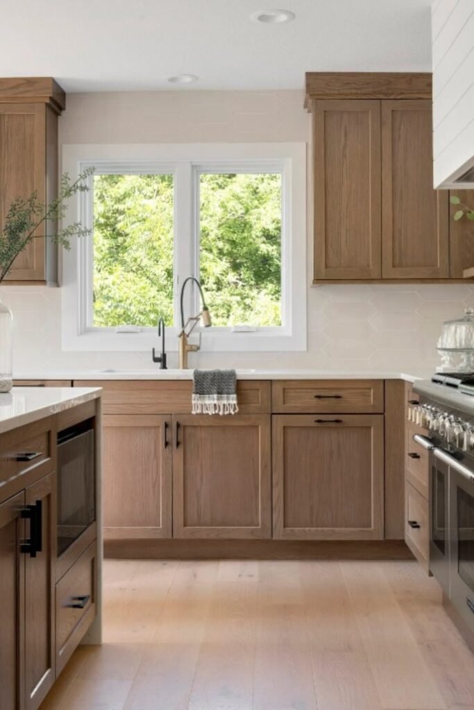 If you want natural wood cabinets to feel timeless, you can lean into warm tones and classic details.