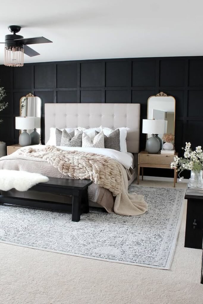 When you use black paneling, you give the room structure and depth, but you should balance it with soft bedding, light wood nightstands, and warm textures so it doesn’t feel overwhelming.